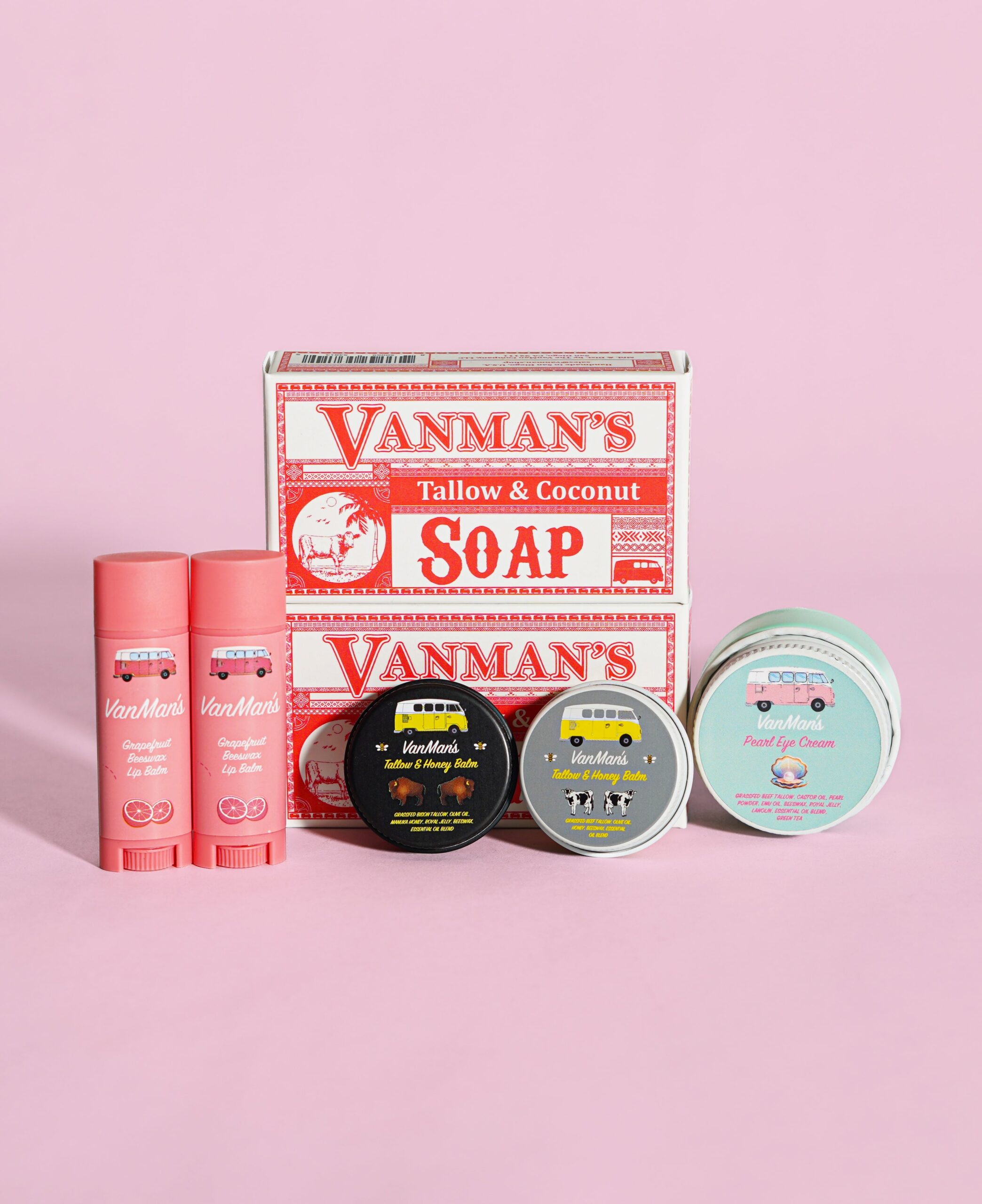 Includes: One pearl eye cream, two tallow & coconut soaps (grapefruit scented), two grapefruit lip balms, one bison balm tiny, and one tallow balm tiny