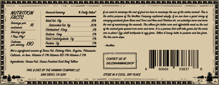 Liquid gold! (When melted). This is the same 100% grass fed & finished suet tallow that we use in all our products. The same we will use to cook fries at our new restaurant.